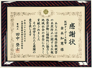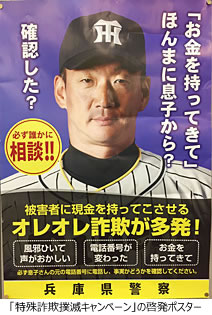 4月6日(水)、兵庫県警察本部から金本知憲監督へ、昨年12月より行われた「特殊詐欺撲滅キャンペーン」の啓発ポスターへ肖像使用協力をしたことによる感謝状が贈呈されました。