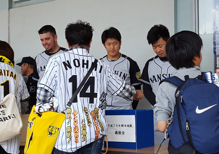 阪神タイガースからは、ランディ・メッセンジャー選手、榎田大樹選手、岩貞祐太選手の3名が義援金募金へのご協力を呼びかけさせていただきました。
