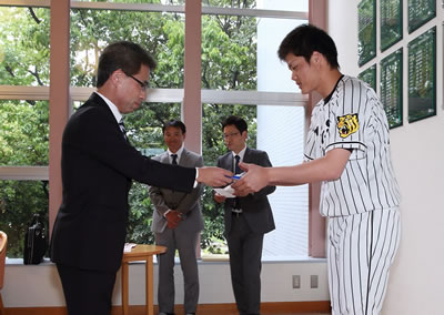 10日(火)、この日予定しておりましたウエスタン・リーグ 対オリックス・バッファローズ戦が雨天中止となったため、阪神鳴尾浜球場に隣接する虎風荘にて表彰式を行いました。