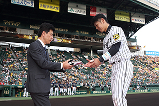 球団選定5月度月間最優秀選手に原口文仁選手が選ばれ、14日(火)、オリックス・バファローズ戦の試合前に表彰式を行いました。