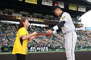 受賞した原口文仁選手には、球団およびスポンサー各社、また公式ファンクラブ会員を代表して、大阪府 平田紫乃様より賞品と記念品が授与されました。