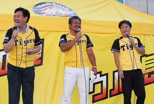 28日(木)、チームも4連勝と波に乗ってきた“ウル虎の夏2016”開催3日目。この日のトークショーにはタイガースOB遠山奬志さんが、そしてシャンプーハット こいでさんには、一日を通して様々な場面に登場していただきました。