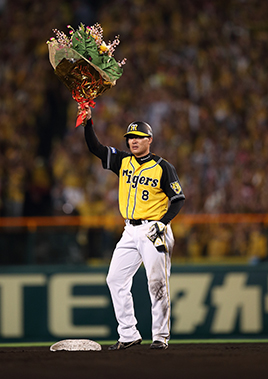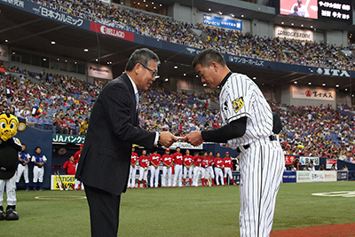 17日(水)、京セラドーム大阪での広島東洋カープ戦の試合前に、7月30日(土)に阪神甲子園球場で開催した対中日ドラゴンズ戦でサイクル安打を達成した福留孝介選手の連盟表彰を行いました。