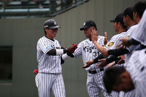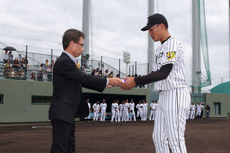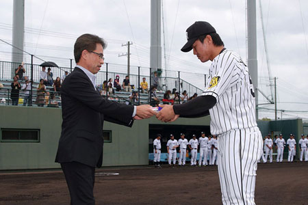 28日(水)、阪神鳴尾浜球場で行われたオリックス・バファローズとの練習試合前に表彰式を行い、受賞した秋山拓巳選手と陽川尚将選手へ球団およびスポンサーより賞品と記念品が授与されました。