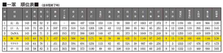 一軍順位表の数値に誤りがございました。 正しい表は以下の通りです。