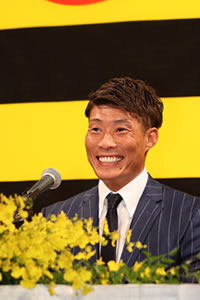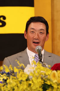 来年から阪神タイガースさんでプレーさせてもらいます、糸井嘉男です。監督を胴上げするために必死になって頑張りたいと思います。応援よろしくお願いします。