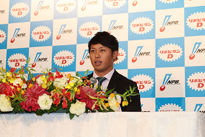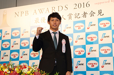 28日(月)、東京都内のホテルにて開催された「NPB AWARDS 2016 supportred by リポビタンD」にて「最優秀新人賞」(新人王)を受賞した髙山俊選手が受賞会見を行いました。