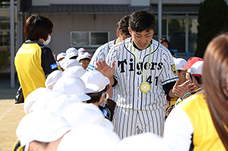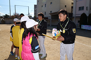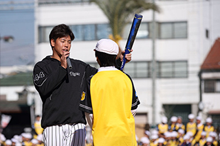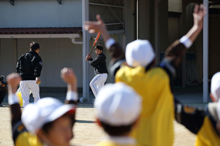 7日(水)、大阪府の『トップアスリート小学校ふれあい事業』の一環として、高橋聡文選手と梅野隆太郎選手が大阪市立大和田小学校を訪問しました。