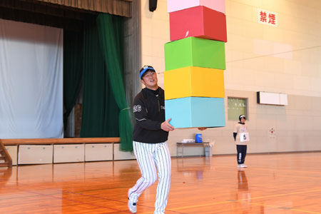 歳内選手と守屋選手は他球団から参加した選手らとともに、県内の小学生約300人とリレーや綱引きなどのゲームで交流しました。