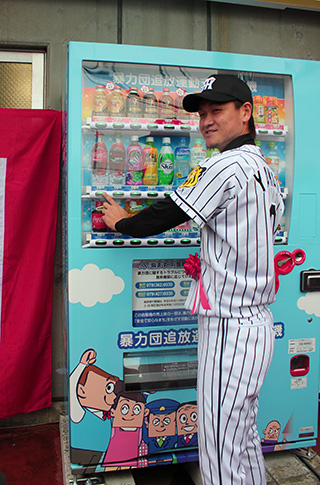 13日(火)、阪神鳴尾浜球場にて「暴力団追放運動支援自販機」の設置式を行い、暴力団追放兵庫県民センターの不当要求断固拒否ポスターにも協力している大和選手が除幕と第1号の購買を行いました。