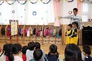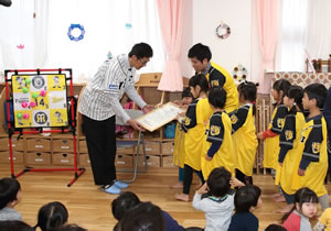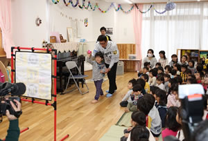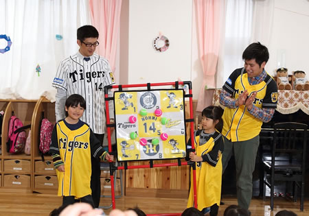 園児より西宮市からの感謝状を送られた能見選手は、「オリジナルストラックアウト」を使ったゲームや記念写真を撮るなどして園児たちとふれあい、また、園児からは御礼にと歌のプレゼントをいただきました。