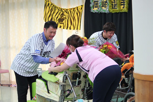 あたたかい歓迎を受けた選手たちは、質問コーナーや記念撮影などで施設利用者の皆さんと交流。最後には、施設利用者の皆さんから選手たちへ感謝状と花束が贈呈されました。
