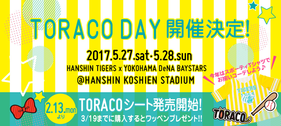 5月27日(土)・28日(日)の2日間において、『お揃いコーデで甲子園へ行こう!』をテーマとした女性ファン向けイベント『TORACO DAY』を開催します!また、TORACO DAY2日間の限定企画チケット「TORACOシート」と「デートチケット」を、2月13日(月)10:00より数量限定で発売します。