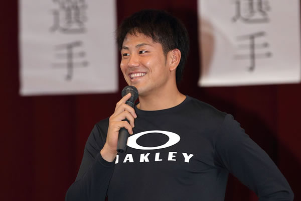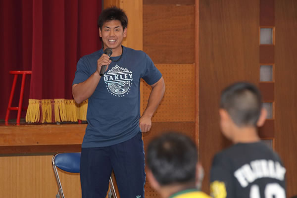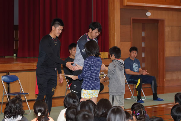 あたたかい歓迎を受けた選手たちは、1年生から5年生の生徒の皆さんからの質問に笑顔で答えるなど、楽しい時間を過ごしました。