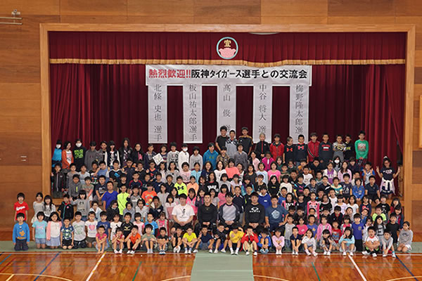 - 梅野隆太郎選手、中谷将大選手、髙山俊選手、板山祐太郎選手、北條史也選手が宜野座村立宜野座小学校を訪問
