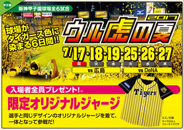 恒例の夏イベント「ウル虎の夏2017」を、7月17日(月・祝)~7月19日(水)対広島戦、7月25日(火)~7月27日(木)対横浜DeNA戦の計6試合で開催します。