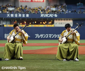 4日(火)、京セラドーム大阪でのホーム開幕戦にて、開幕セレモニーを行いました。今年も豪華有名人の方々にご参加いただいた「みんなで六甲おろし 2017」第1弾のお披露目に始まり、世界で活躍する津軽三味線の兄弟奏者、吉田兄弟による迫力ある演奏で、会場が多いに盛り上がりました。また「みんなで六甲おろし 2017」第一弾のメインボーカルを務めていただきました、大阪出身のシンガー・ソングライター矢井田瞳さんによる国歌独唱・ファーストピッチなどで、2017シーズンに“挑む”阪神タイガースのホーム開幕戦を華々しく彩っていただきました。