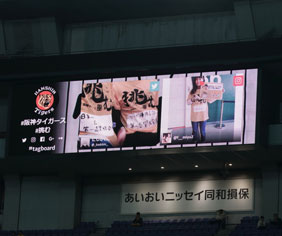 また入場者の方々にお配りした『挑むTシャツ』に皆さんの今年“挑む”ことを記入いただき、「#阪神タイガース」「#挑む」のハッシュタグをつけて、SNSに投稿してもらうと、イニング間などに京セラドーム内のビジョンに表示、または公式サイト内特設サイトに掲載するイベントを実施いたしました。