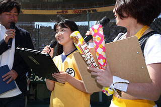 試合開始前のグランドでMC体験をしてもらうこどもを当日に募集。本日ちびっこMCを務めてくれたのは、高知県からお越しのはずみちゃん!スタジアムDJと一緒に球場を盛り上げてくれました!