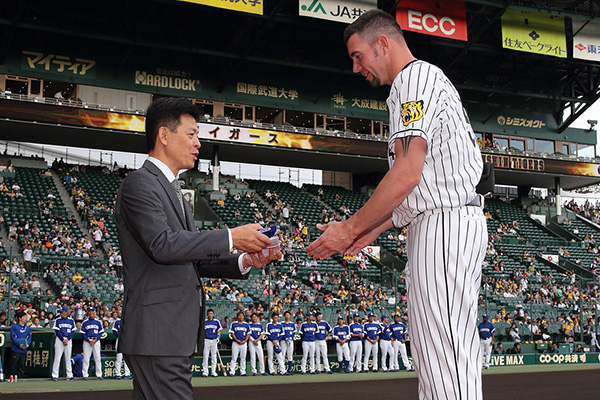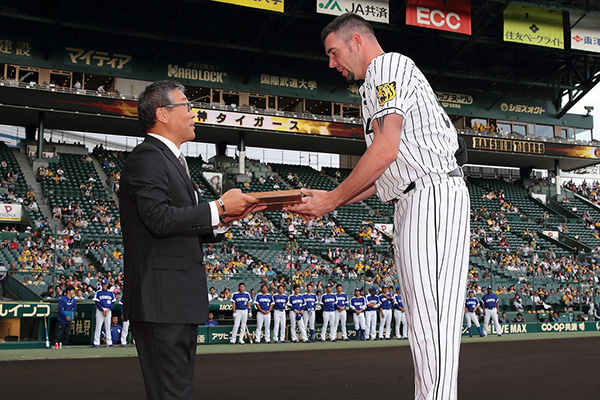 17日(水)、阪神甲子園球場で中日ドラゴンズ戦の試合前に、3・4月度日本生命月間MVP賞を受賞したランディ・メッセンジャー選手の連盟表彰を行いました。