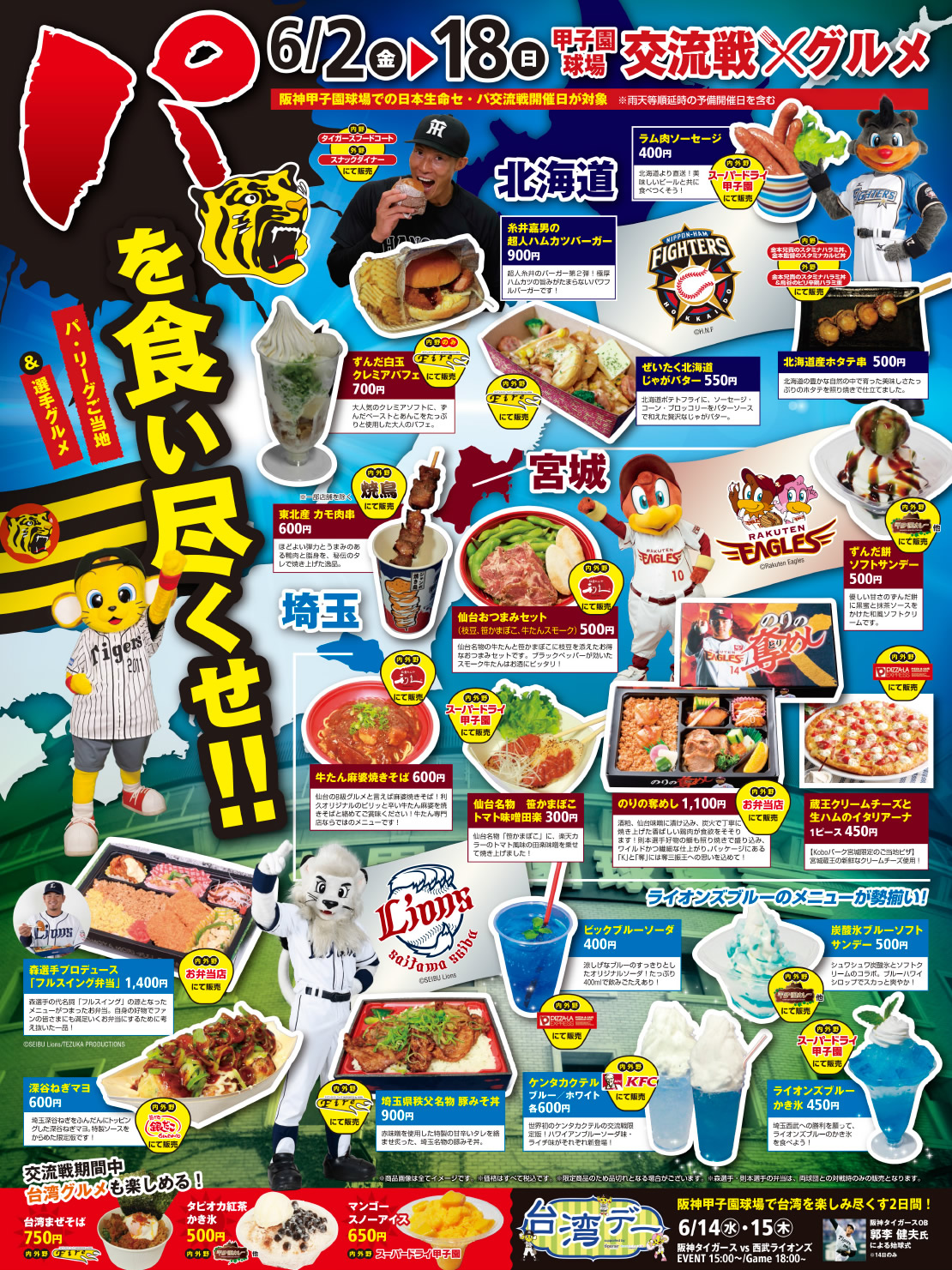 阪神甲子園球場では、阪神タイガース主催の日本生命セ・パ交流戦全9試合(6月2日(金)から6月18日(日))において、「“パ”を食い尽くせ!交流戦限定グルメフェア」を開催します。