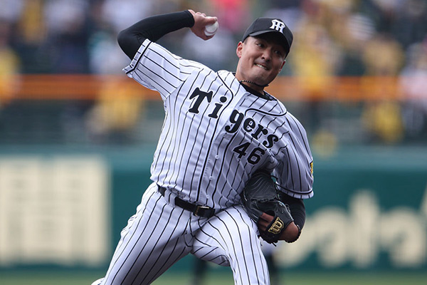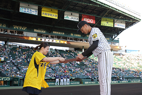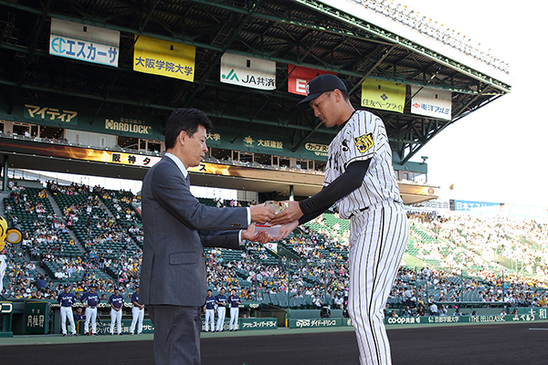 球団選定5月度月間最優秀選手に秋山拓巳選手が選ばれ、14日(水)、阪神甲子園球場での埼玉西武ライオンズ戦の試合前に表彰式を行いました。