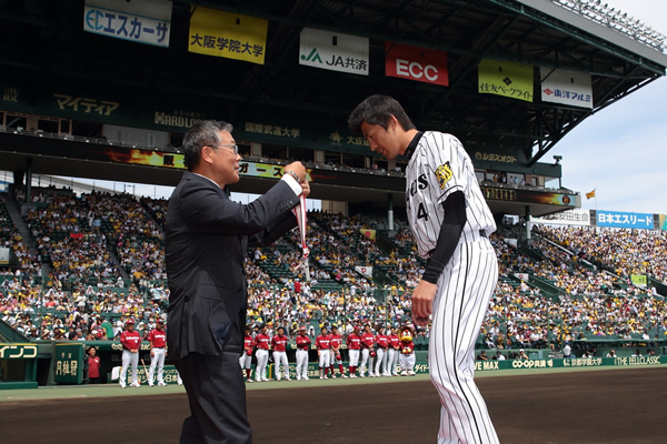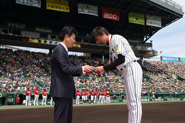 17日(土)、阪神甲子園球場での東北楽天ゴールデンイーグルス戦の試合前に、5月17日(水)の対中日ドラゴンズ戦(阪神甲子園球場)で、公式戦通算1500投球回を達成した能見篤史選手の連盟表彰を行いました。