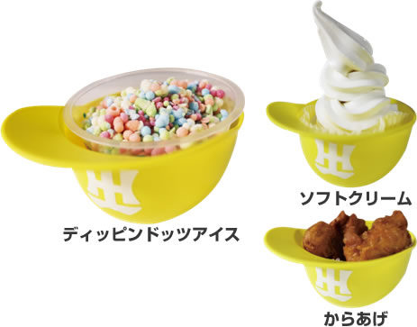 限定容器付き!![]() ▲ヘルメット付き商品 各650円 販売店:甲子園カレー店舗 他 | ![]() ▲ケンタカクテル ウル虎イエロー (グレープフルーツ) 600円 販売店:KFC | ![]() ▲ディッピンドッツ レモンソーダフロート 550円 販売店:内野2F ディッピンドッツ 内野3F スイーツ・カフェ 外野2F CoCo Park |