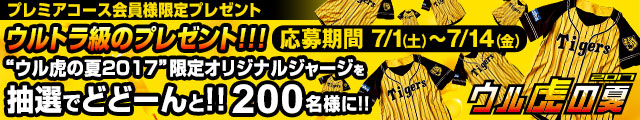 公式スマホ携帯サイトではプレミアコースにご加入いただいている皆様を対象に、夏の一大イベント“ウル虎の夏2017”において球場来場者のみにプレゼントされる「ウル虎の夏限定オリジナルジャージ」を抽選で200名様にプレゼントいたします!