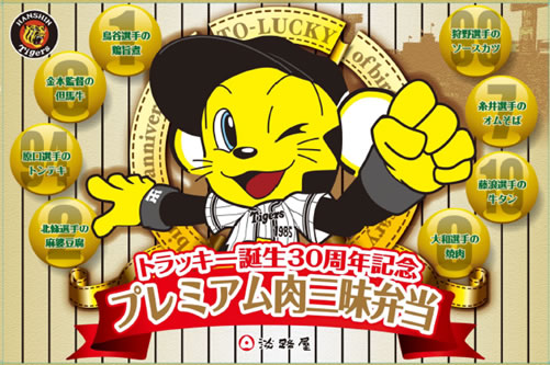 トラッキー命名30周年を祝う「プレミアム肉三昧弁当 1、500円」が今シーズン限定で新登場!金本監督・各選手(大和選手、鳥谷選手、北條選手、糸井選手、藤浪選手、原口選手、狩野選手)弁当の人気具材を盛り込み、トラッキーを盛大に祝福!!ご購入者にはもれなく「まねき虎ボールチェーン トラッキーVer」、サーティワンアイスの「タイガーストライプ」半額購入券(400円⇒200円)をプレゼントいたします。※グリーン上段セレクトチケット引換対象外