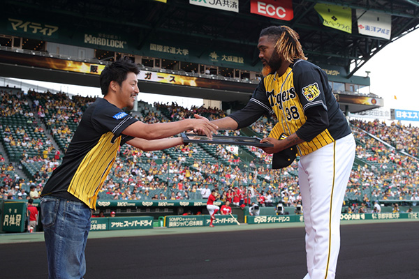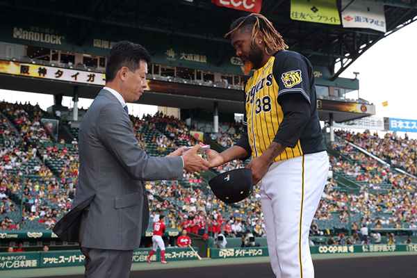 球団選定6月度月間最優秀選手にマルコス・マテオ選手が選ばれ、18日(火)、阪神甲子園球場での広島東洋カープ戦の試合前に表彰式を行いました。