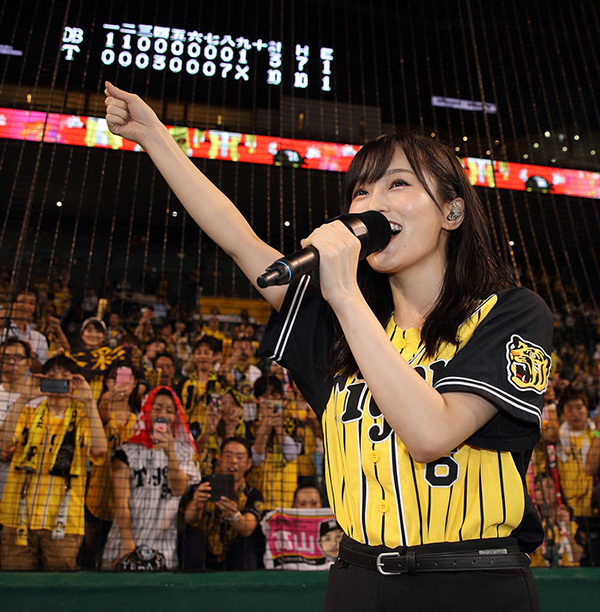 山本彩さんは5回裏終了時に「みんなで六甲おろし」を生歌唱!タイガース愛あふれる丁寧で伸びやかな歌声とスタンドのファンに音頭をとるキュートな姿に会場はさらに大盛り上がり。