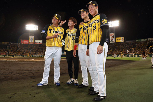途中、雨で試合が一時中断しましたが見事タイガースが勝利!!試合後のグラウンドで陣内智則さんとヒーロー選手と記念撮影を!