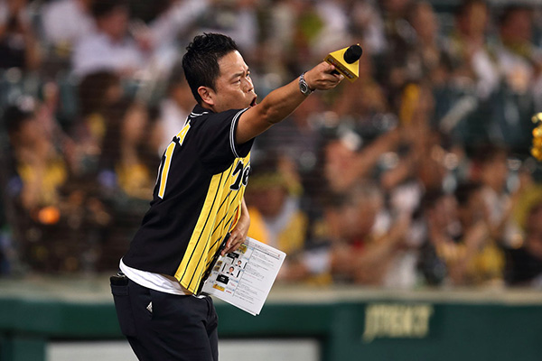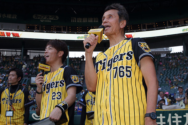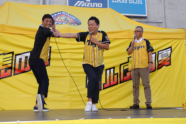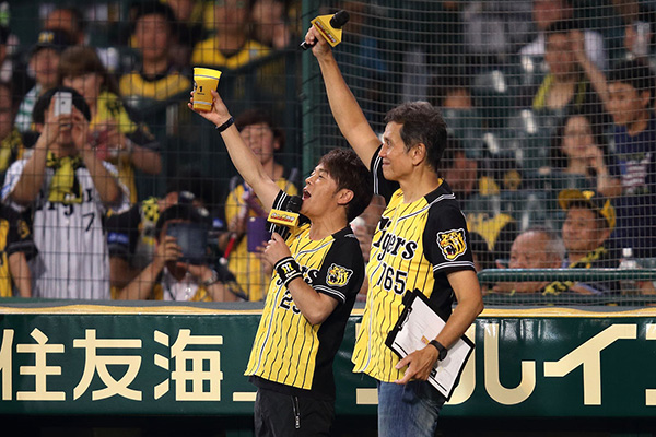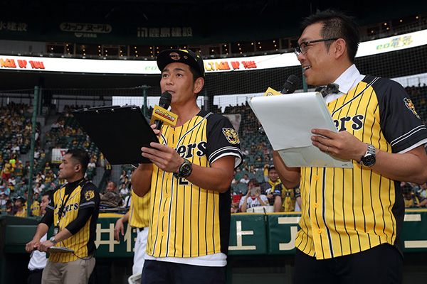 また阪神ファン代表芸人としてココリコの遠藤章造さんが登場!試合前のスタメン選手の呼び出しや6回裏には会場の皆さんと一緒に乾杯イベントに出演いただきました。