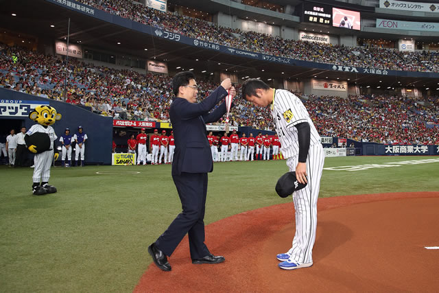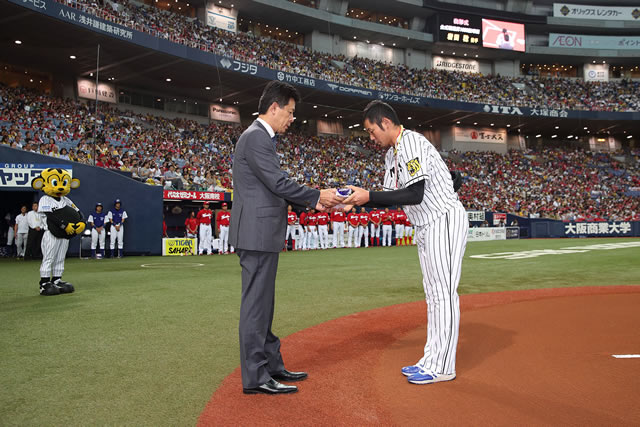16日(水)、京セラドーム大阪での広島東洋カープ戦の試合前に、8月3日(木)の対広島東洋カープ戦(MAZDA Zoom-Zoomスタジアム)で、公式戦通算1000投球回を達成した岩田稔選手の連盟表彰を行いました。