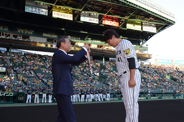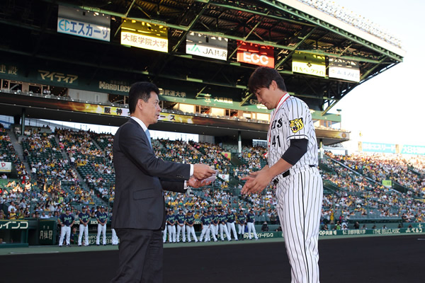30日(水)、阪神甲子園球場での東京ヤクルトスワローズ戦の試合前に、8月17日(木)の対広島東洋カープ戦(京セラドーム大阪)で、公式戦通算500試合登板を達成した髙橋聡文選手の連盟表彰を行いました。