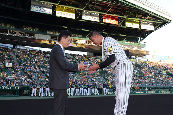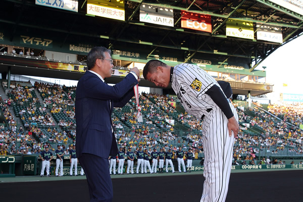 30日(水)、阪神甲子園球場での東京ヤクルトスワローズ戦の試合前に、8月12日(土)の対横浜DeNAベイスターズ戦(横浜スタジアム)で、公式戦通算250本塁打を達成した福留孝介選手の連盟表彰を行いました。