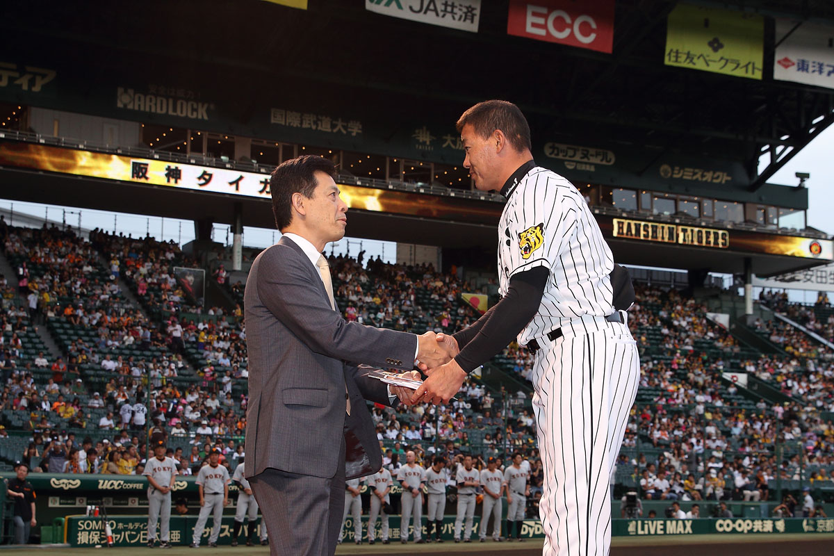 球団選定8月度月間最優秀選手に福留孝介選手が選ばれ、13日(水)、阪神甲子園球場での読売ジャイアンツ戦の試合前に表彰式を行いました。