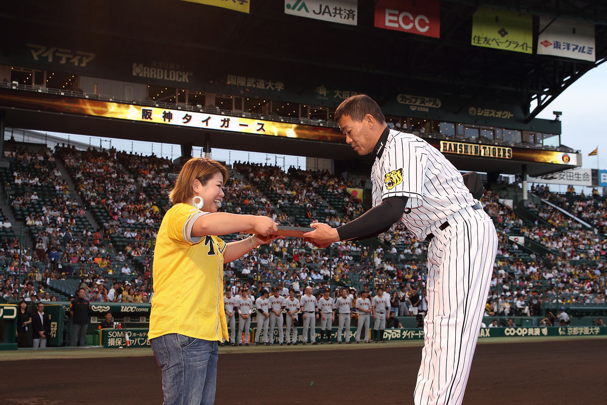 受賞した福留孝介選手には、球団およびスポンサー各社、また公式ファンクラブ会員を代表して、大阪府 奥梨奈子さんより賞品と記念品が授与されました。