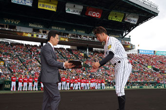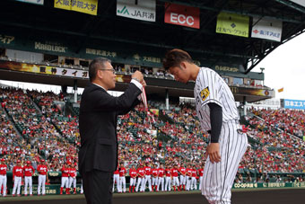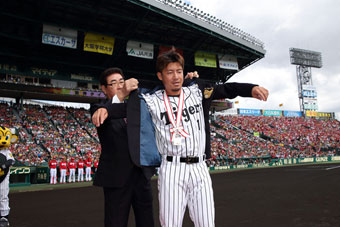 18日(月・祝)、阪神甲子園球場で開催した対広島東洋カープ戦の試合前に、鳥谷敬選手の公式戦通算2000本安打達成の表彰式が行われ、セントラルリーグ野球連盟より記念メダル、球団より記念盾と賞金、各スポンサーより賞品や記念品が贈られました。