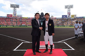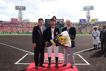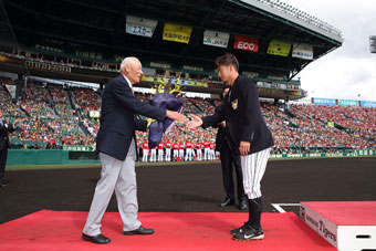 さらに、公式戦2000本安打の名球会ブレザー授与式が行われ、日本プロ野球名球会 山本浩二理事長より名球会ブレザーが、阪神タイガースOB 小山正明さんより花束が授与されました。