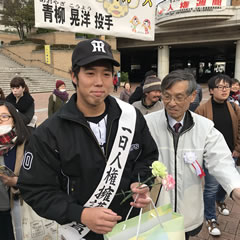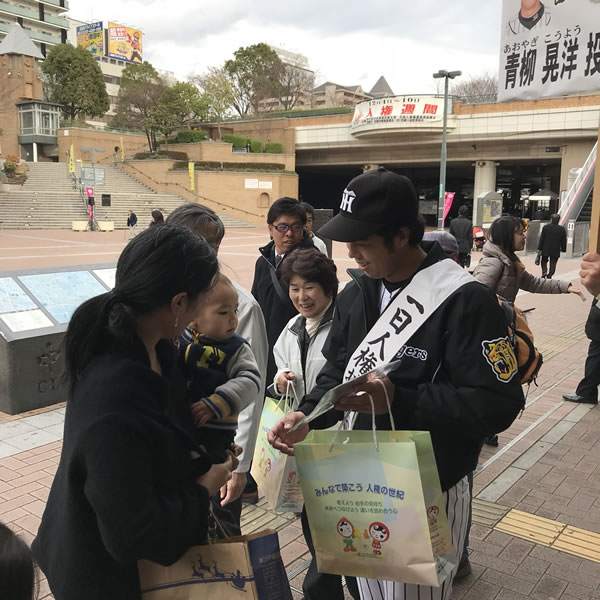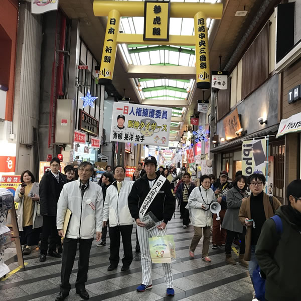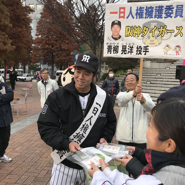 8日(金)、青柳晃洋選手が兵庫県尼崎市の「人権週間街頭啓発キャンペーン」に参加し、一日人権擁護委員を務めました。委嘱式で一日人権擁護委員を任命された青柳選手は、阪神尼崎駅前を中心に街頭で啓発活動を行いました。
