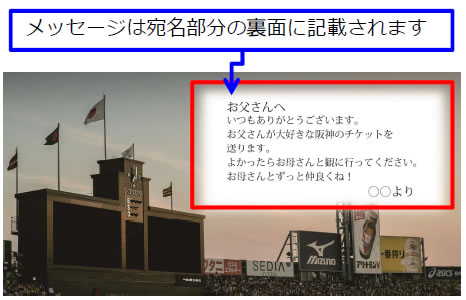 選手や球場の風景の写真などが印刷された限定デザインのチケット券面とオリジナルメッセージ部分は、観戦の思い出をカタチとして残していただけます。お誕生日や母の日・父の日のプレゼント、結婚記念日などの特別な記念日のお祝いなど様々なシチュエーションにご活用ください。