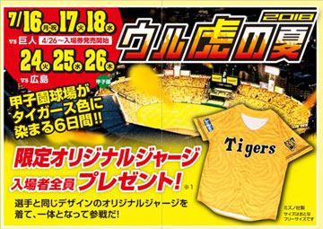 恒例の夏イベント“ウル虎の夏2018”を、7月16日(月・祝)~7月18日(水)対巨人戦、7月24日(火)~7月26日(木)対広島戦の計6試合で開催します。
