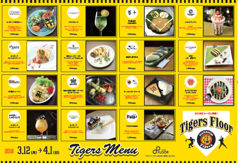 また、3月12日(月)~4月1日(日)までの21日間、グランフロント大阪北館6階のウメキタフロアが「Tigers Floor」となり、タイガースをイメージしたオリジナルメニューやフォトブース、オリジナルメニュー購入者限定“Tigers Kuji”など、フロア全体がタイガース一色に染まります。