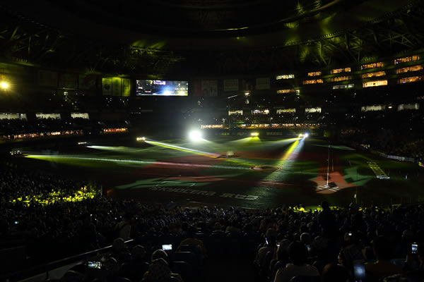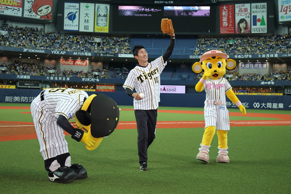 6日(金)、京セラドーム大阪でのホーム開幕戦にて、開幕セレモニーを行いました。今年も豪華有名人の方々にご参加いただいた「みんなで六甲おろし 2018」のお披露目に始まり、今年はドーム内で光と音のセレモニーを開催。試合前に劇団四季の俳優、苫田亜沙子さんによる国歌独唱と陸上競技選手の桐生祥秀さんによるファーストピッチで開幕戦を華々しく彩っていただきました。