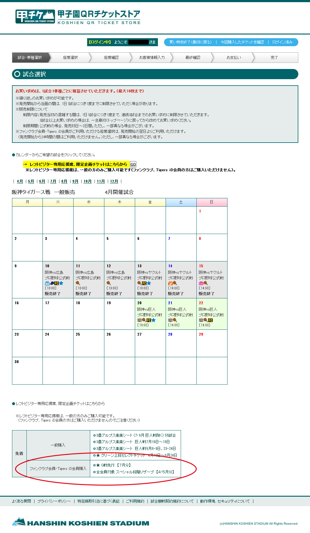 ファンクラブチケット特典「G戦先行」及び「スペシャル段階リザーブ」チケットの購入を甲チケで行う場合、カレンダー下にある表内の「G戦先行」及び「スペシャル段階リザーブ」からお進みください。※カレンダーからはご選択いただけません。