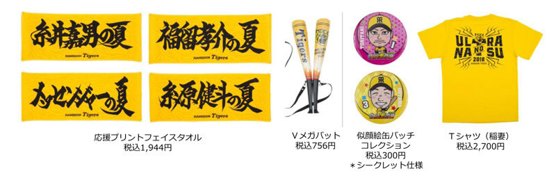 初登場の書道家の晃鳳氏き下ろしの“応援プリントフェイスタオル ウル虎 .ver ”から人気の応援グッズまで多数ラインナップ!選手への思いを書体に込めた大人気“応援プリントフェイスタオル”のウル虎の夏.verからTシャツ・Vメガバット・似顔絵缶バッチ・クリアファイルまで多数ラインナップ!