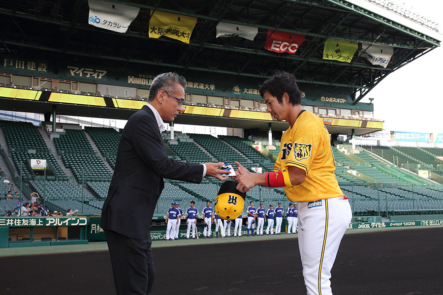 球団選定ファーム6月度月間最優秀選手に緒方凌介選手が選ばれ、20日(金)、阪神甲子園球場で開催したウエスタンリーグ 対中日ドラゴンズ戦の試合前に表彰式を行いました。