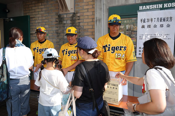 阪神タイガース、阪神タイガース選手会、阪神タイガースOB会では、7月16日(月・祝)~18日(水)に阪神甲子園球場で行われました対巨人戦、同じく20日(金)~22日(日)に行われましたウエスタン・リーグ公式戦対中日戦にて、平成30年7月豪雨で被害に遭われた方々への支援のために、募金活動を行いました。